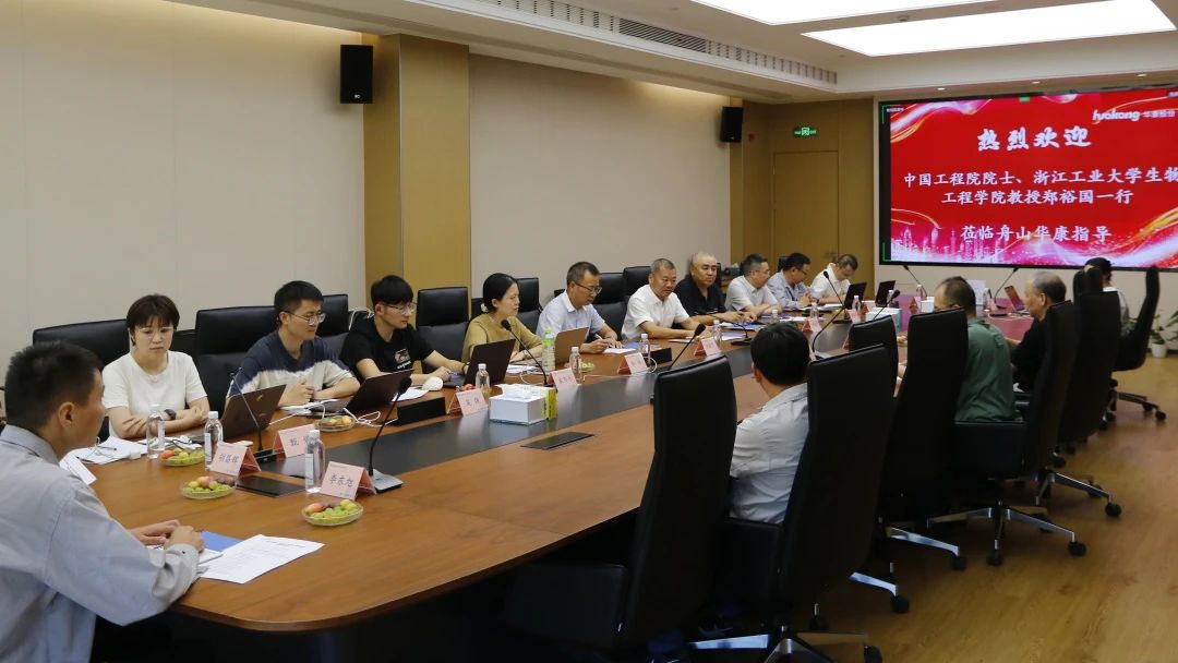 2025 年 8 月 25 日,中国工程院院士、浙江工业大学生物工程学院教授郑裕国,浙工大华东合成生物学产业技术研究院副院长柳志强莅临舟山华康,与定海工业园区管委会主任姚庆、公司董事长陈德水、首席科学家李勉博士等核心团队围绕舟山华康 100 万吨玉米精深加工项目进展、发酵类关键技术攻关等议题,开展高规格深度交流座谈,为企业破解研发瓶颈、加速产业升级注入权威智力支持。